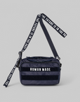 Horizontal military pouch that can be worn diagonally. Removing the magic tape on the front reveals text, adding a playful touch.